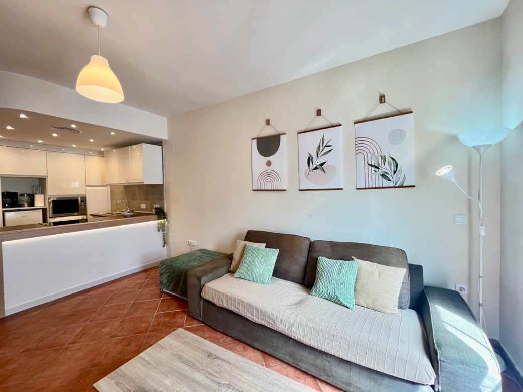 The living room of this Apartment in Benalmadena Pueblo offers a large sofa, a modern wall unit with additional cupboard space housing a Flat-screen 55” Smart TV.